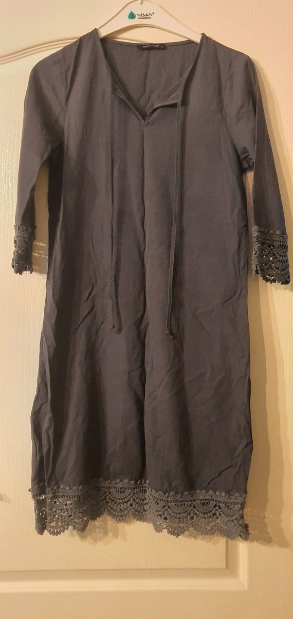 Gri uzun keten elbise, bol kesim, drapeli detaylar ve uzun kolludur. V yaka ve manşetlerde, etekte tığ işi süslemeler bulunur, bohem tarz için uygundur.