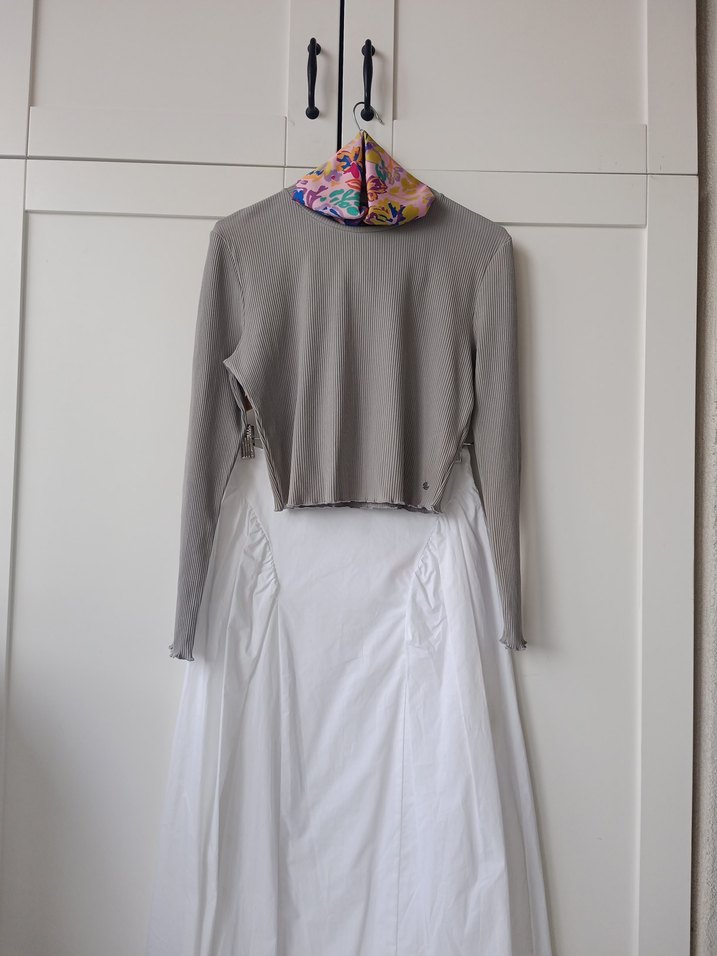 Gri uzun keten kumaştan, bol kesim ve drapeli tasarıma sahip hamile eteği. Günlük kullanıma uygun, şık ve avant-garde tarzda.