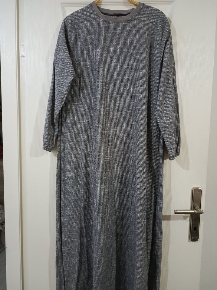 Gri keten kumaştan uzun, bol kesim elbise, drapeli ve uzun kollu. Minimalist ve sade görünüme sahip, günlük kullanıma uygun.