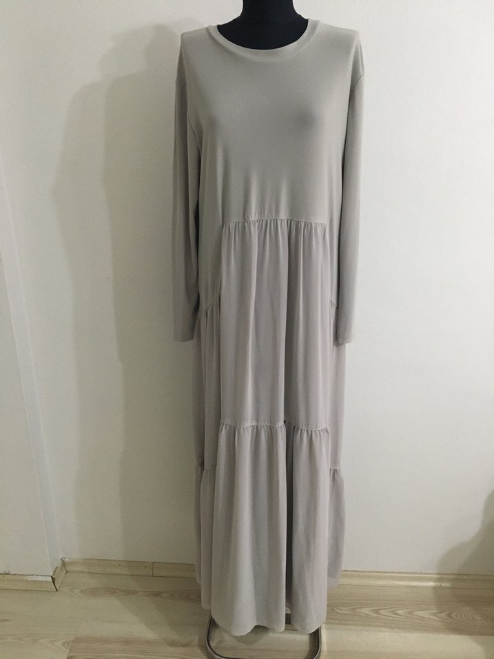 Yumuşak keten kumaştan, bol kesim gri uzun elbise. Uzun kollu ve yuvarlak yakalı, desen içermeyen sade tasarımıyla günlük kullanım için rahat ve şık. 2 kere kullanıldı