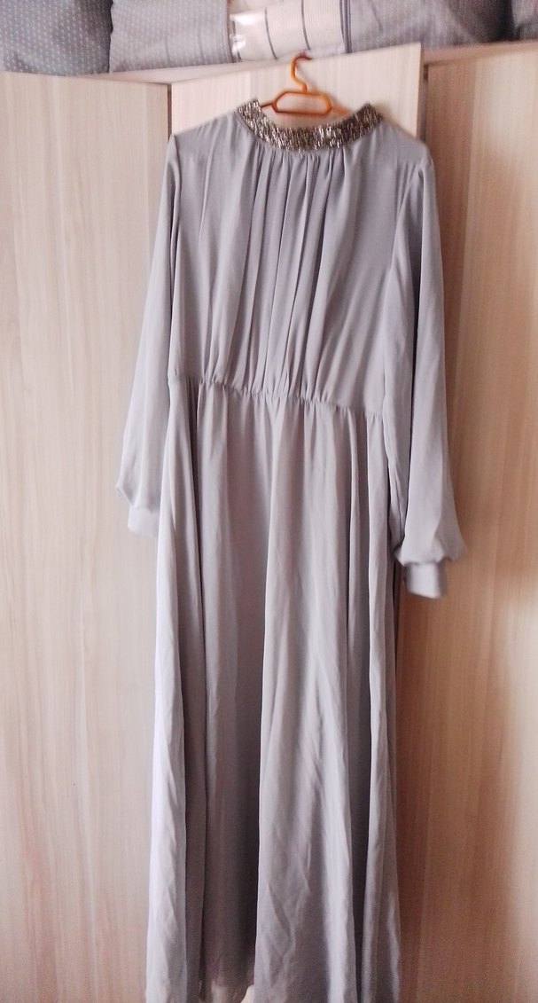 gri j uzun elbise, dökümlü tasarım, yüksek yaka ve uzun kollu. Bol kesim, minimalist bohem tarzında, düğün için uygun.