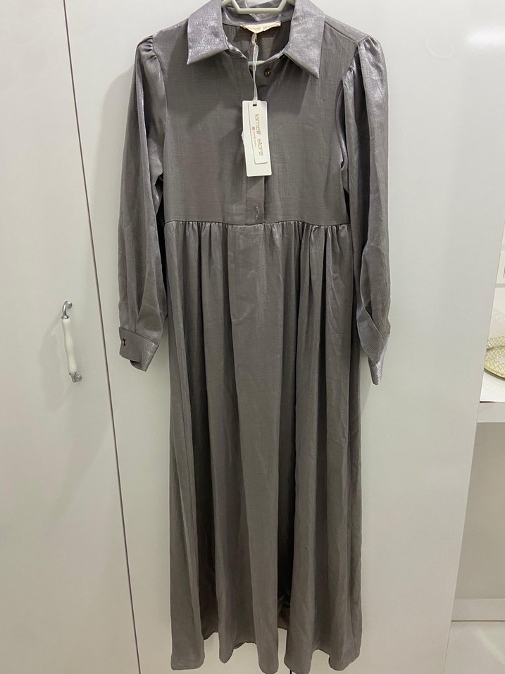 Gri keten kumaştan, uzun kollu, yakalı ve pilili detaylara sahip bol kesim uzun elbise. Ofis için uygun, sade ve zarif Parisian stilinde.