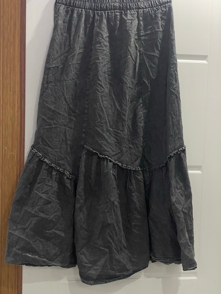 Gri renkli uzun keten etek, bol kesim ve fırfır detaylarıyla bohem tarzını yansıtıyor. Desensiz olup günlük kullanım için uygundur.koli 5