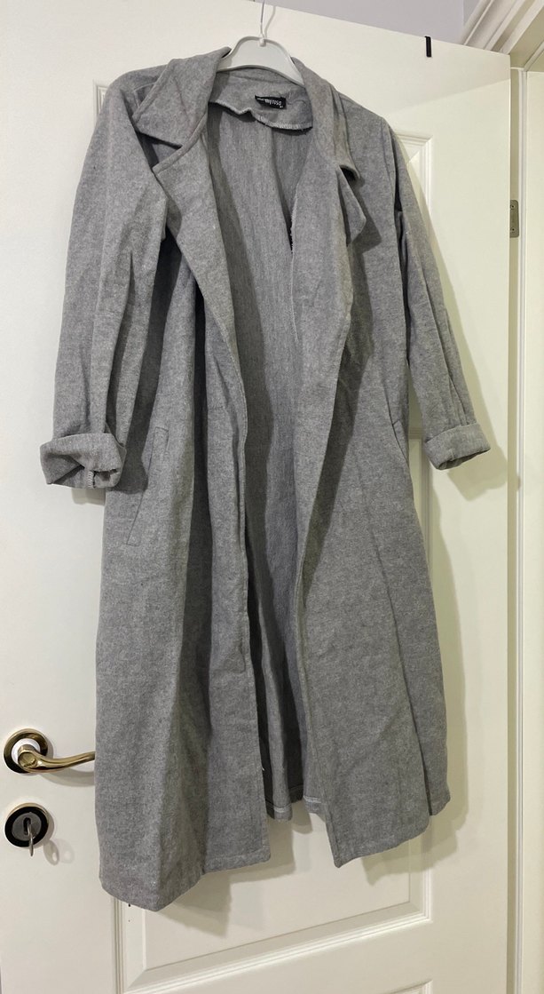 Gri renkli uzun keten kaban, bol kesim, yakası kesik ve drapeli detaylara sahiptir. Günlük rahat kullanıma uygundur.