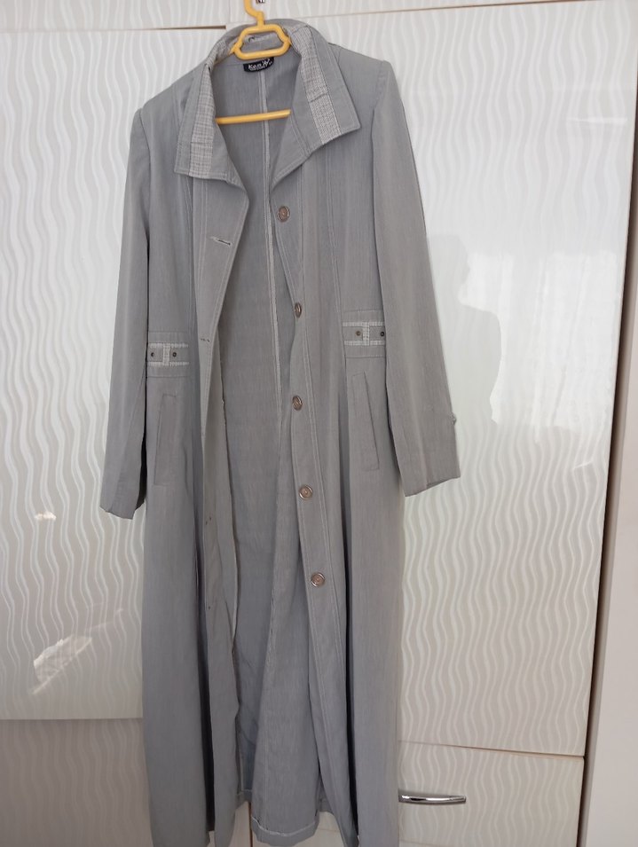 Gri renkte, keten kumaştan uzun kadın kaban. Düğmeli ve klasik yaka detaylı, rahat kesim ile ofis kullanımına uygundur.
