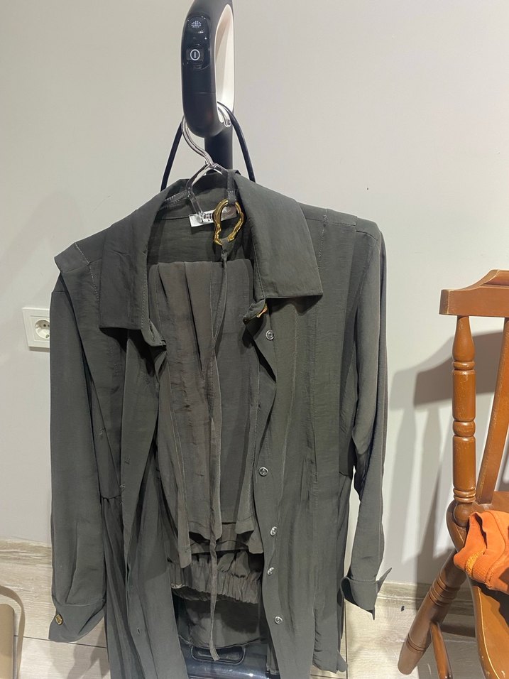 Uzun, bol kesim gri keten kadın ceket, yakalı ve askılı kollu. Bel kemerli, düz tasarımlı, sokak modasına uygun.