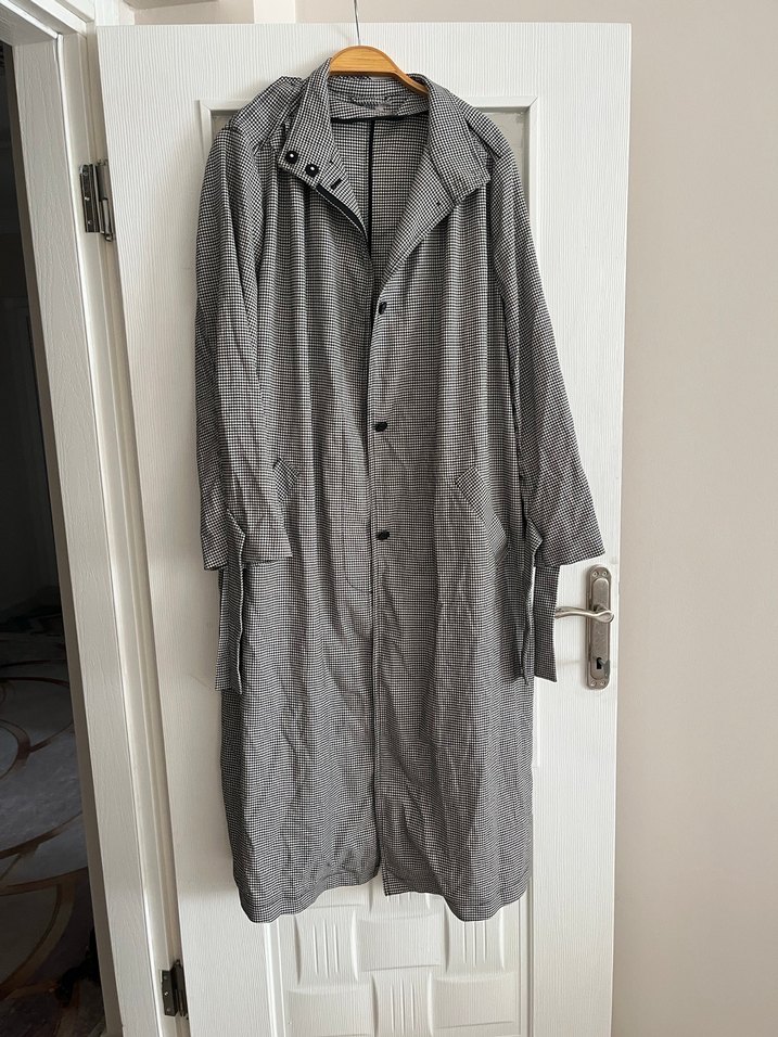 Gri renkte, keten kumaştan uzun ve bol kesim hamile ceketi. Düğmeli ve notlu yakalı, sokak modasına uygun tasarım.