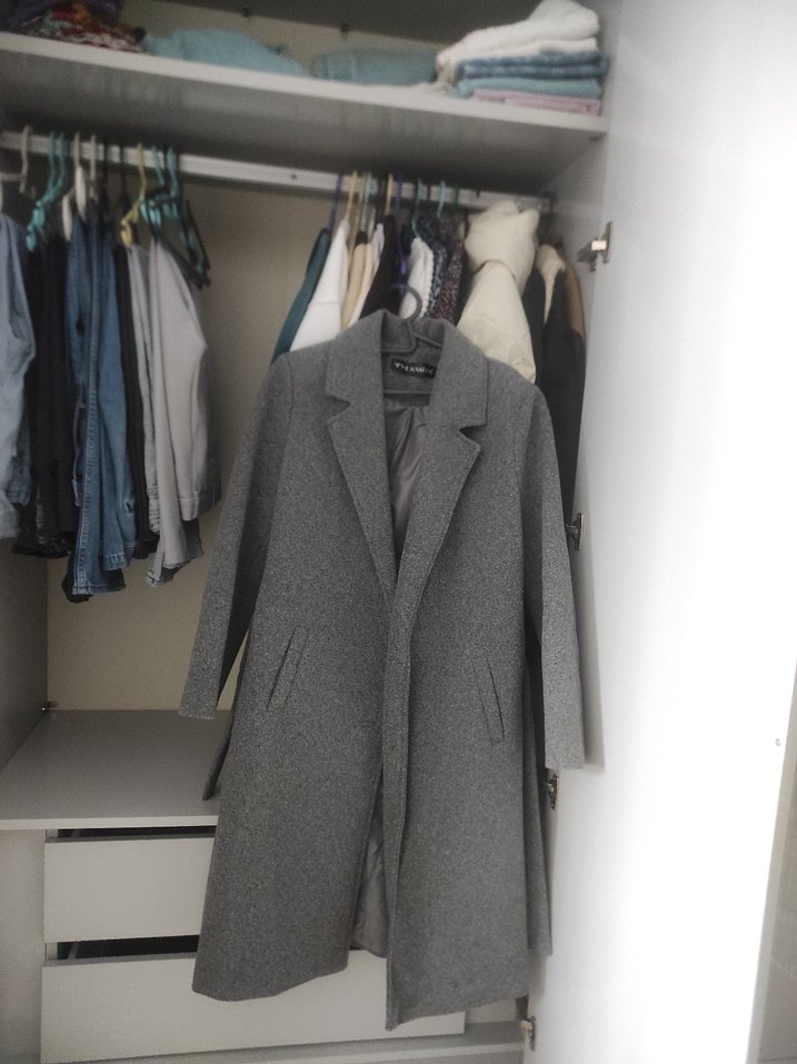 Gri uzun kaban, klasik yakalı ve ön ceplerle tasarlanmıştır. İç kısmı astarlı olup konfor sunar. Serin havalar için uygundur.
