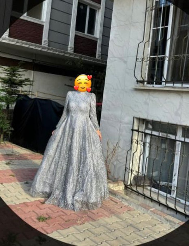 Gri tie-dye desenli, uzun kollu, yüksek yakalı, bol kesim ve drapeli kadın abiyesi, düğünler için uygundur.