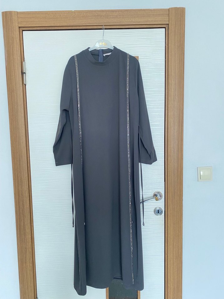 Gri renkte, uzun kollu ve yüksek yakalı kadın elbisesi, drapeli detaylara sahiptir. Minimalist ve sade tasarımıyla günlük kullanıma uygundur.