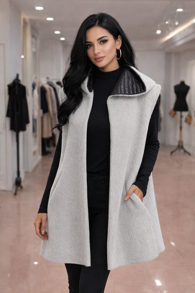 Gri uzun kollarsız yelek, regular fit ve kürk detaylıdır. Askısız yakası ve yumuşak, sıcak kumaşıyla günlük sokak stiline uygundur.