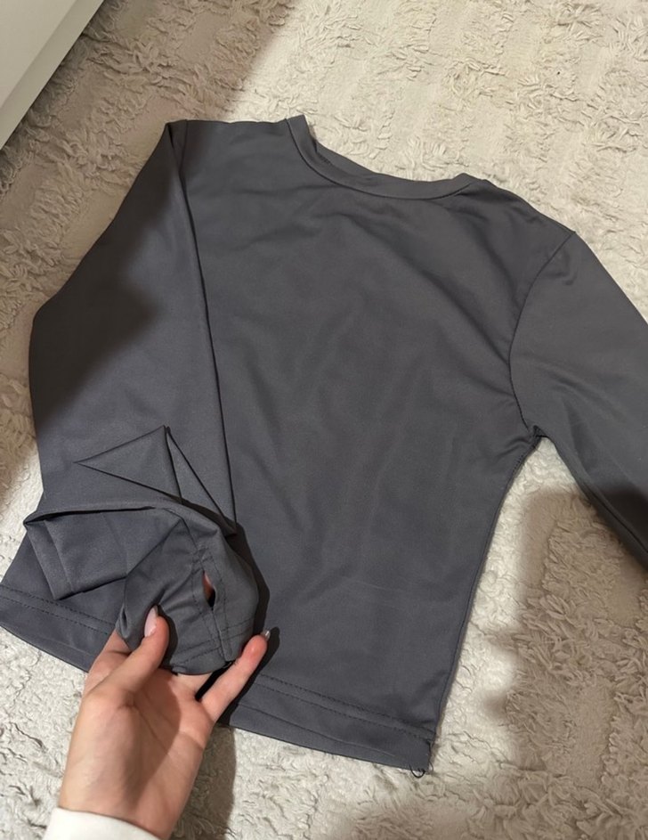 Uzun kollu, bisiklet yaka, gri renkli, rahat sentetik kumaştan yapılmış, günlük kullanıma uygun.