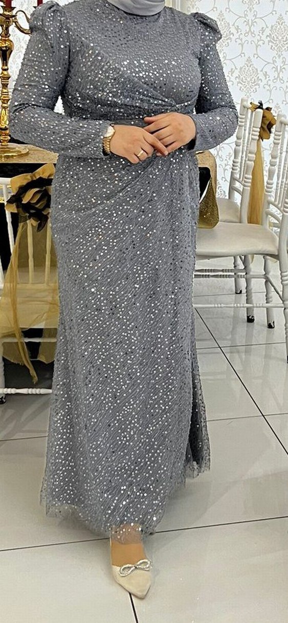 Gri Uzun Kollu Abiye Elbise 48 beden şalı yanında hediye