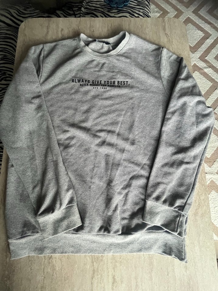 Gri renkli, uzun kollu ve yuvarlak yakalı bol kesim kadın sweatshirt. Pamuklu kumaştan, önünde baskılı motivasyon cümlesi bulunur. Günlük kullanım için uygundur.