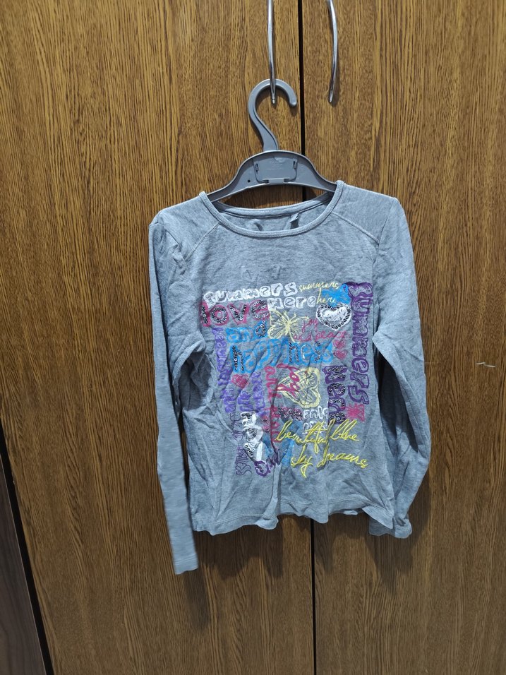 Gri renkte, uzun kollu, bol kesim kız tişörtü. Örgü görünümlü sentetik kumaş ve renkli baskılı desenler bulunur. Yuvarlak yaka, bohem tarz.