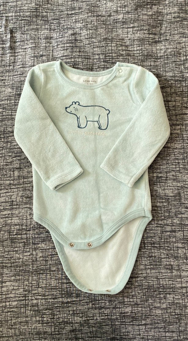 Yumuşak ve sıcak dokulu, gri pastel renkte uzun kollu bebek body. Yuvarlak yaka ve çıtçıtlı kapanışlıdır. Önünde basit bir ayı çizimi bulunur.