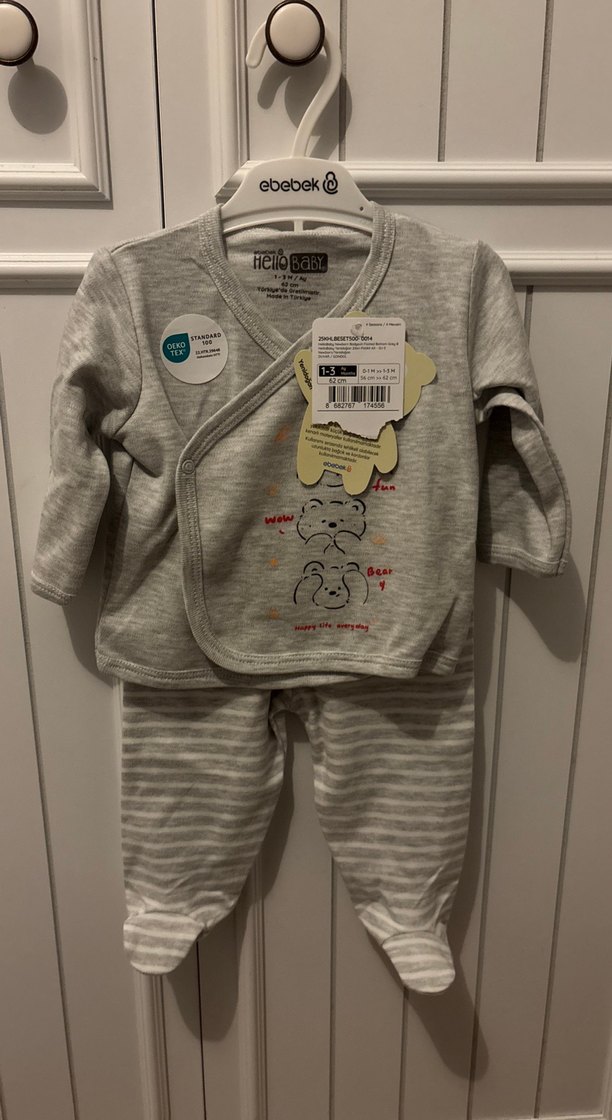 Gri renkli, uzun kollu, yuvarlak yakalı ve yumuşak kumaştan yapılmış baskılı bebek takımı. Rahat ve şık bir kullanım sunar.