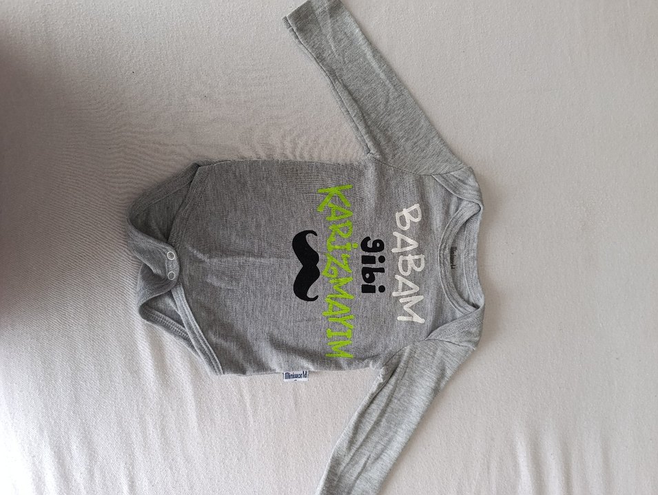 Gri renkli, uzun kollu, düğmeli bebek kız body. Üzerinde "BABAM," "9ibi," "CARIZMAYIM" yazılı baskılar bulunur.