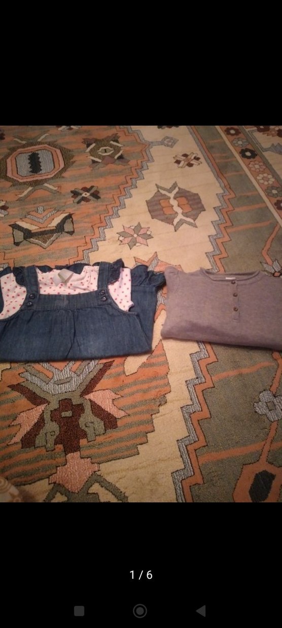 Gri uzun kollu düğmeli üst ve pembe puantiyeli gömlekli kot görünümlü elbise içeren bebek kız takımı.az kullanılmış hiçbir deformasyon yoktur toplu fiyattır tekli takımda alına bilir
