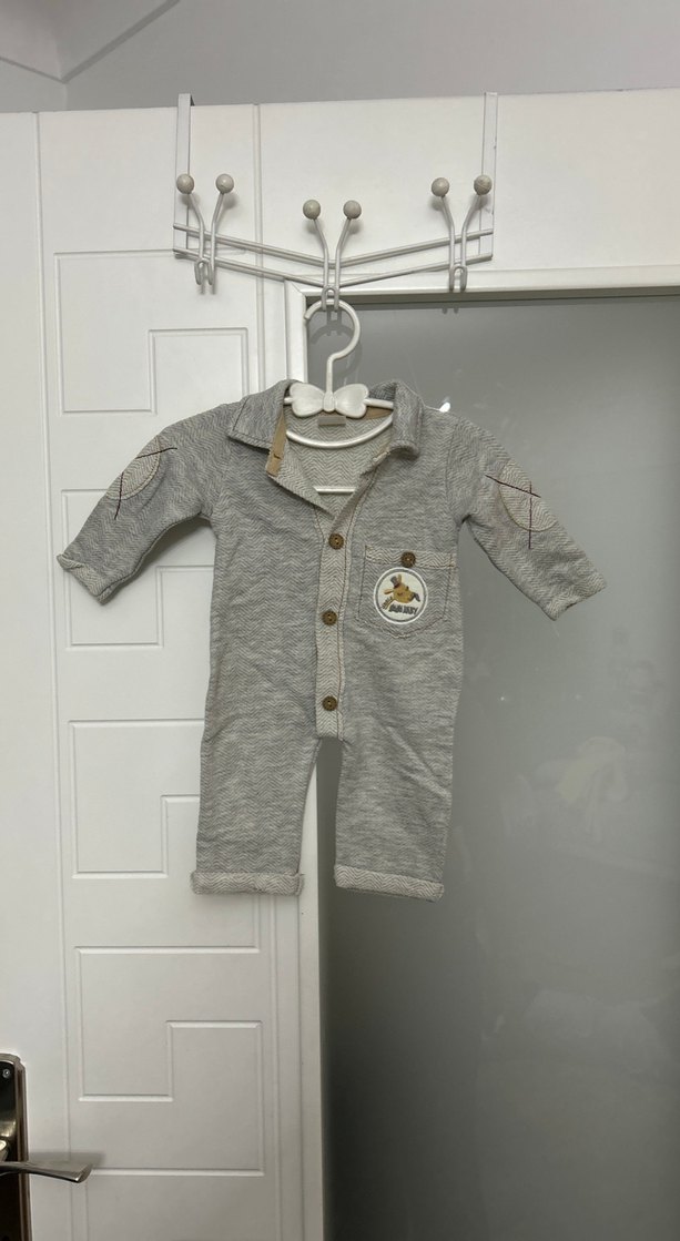 Gri renkte, uzun kollu, düğmeli ve yakalı bebek tulumu. Yumuşak örme kumaştan, desen içermeyen ve sokak modası tarzında bir tasarım.