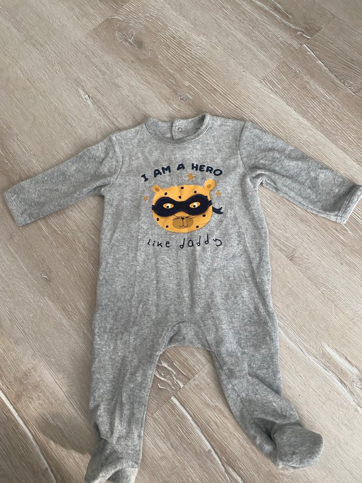 Gri renkli, uzun kollu ve bisiklet yakalı bebek tulumu. Önde baskılı kahraman figürü bulunur. Yumuşak ve sıcak örme kumaştan yapılmıştır, ayaklıdır.