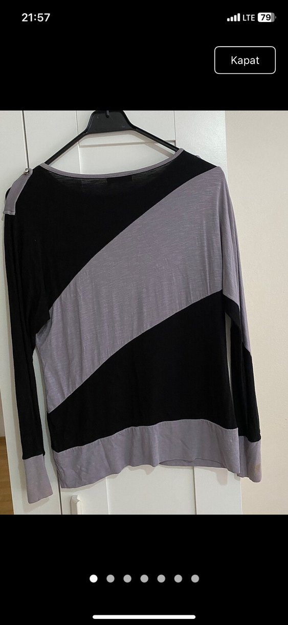 Gri bluzu, uzun kollu ve kayık yaka tasarımıyla dikkat çeker. Rahat kesimi ve drapeli detaylarıyla, midi uzunlukta ve yumuşak sentetik kumaştan üretilmiştir.