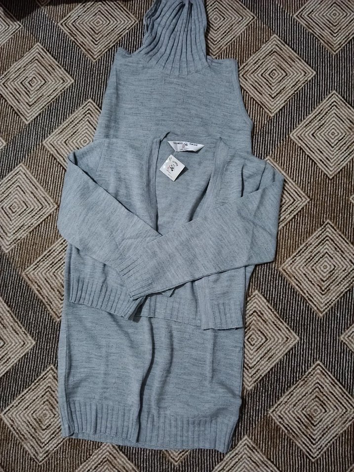 Gri renkli, uzun kollu ve boğazlı örme kadın elbise Rahat kalıp ve uzun boyu ile günlük kullanıma uygundur.