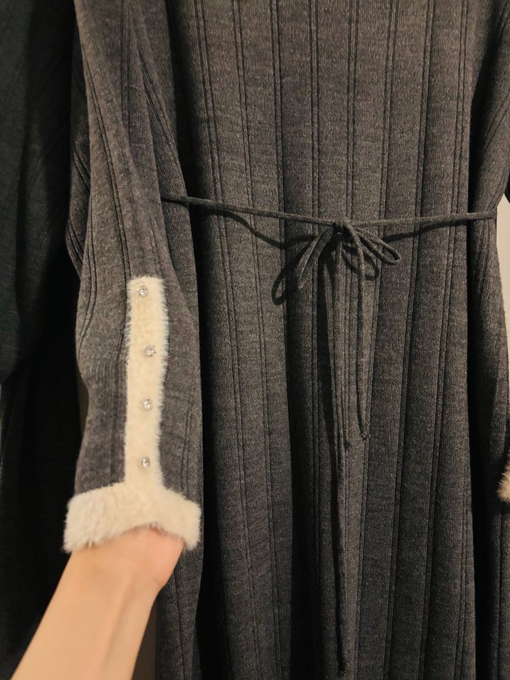 Yumuşak yün kumaştan, bol kesim ve uzun kollu boğazlı gri triko elbise. Manşetlerde kürk detayları ve belde bağlama ipi bulunur. Rahat ve şık bir görünüm sunar. Yalnış elbise ile yıkandığı için beyaz olan kısmı leke oldu 1 kez bile kullanılmadı uyguna bırakıyorum