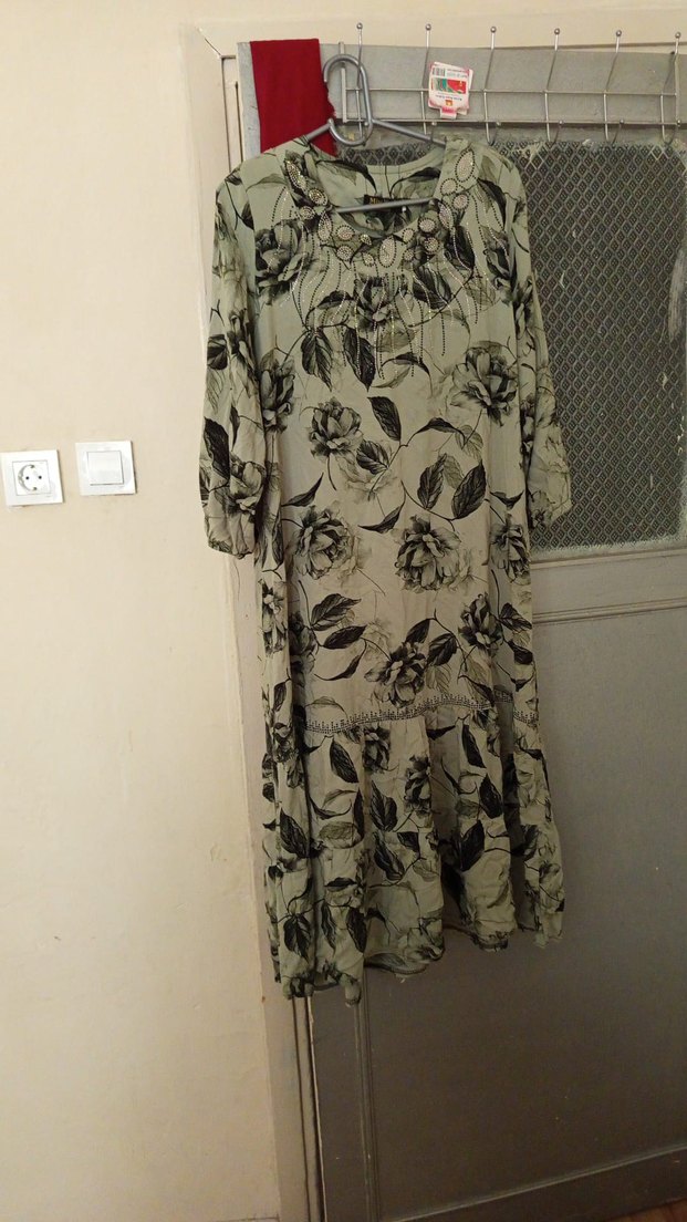 Gri çiçek desenli, uzun kollu ve bol kesim bohem tarzda, yumuşak sentetik kumaştan yapılmış drapeli uzun elbise.