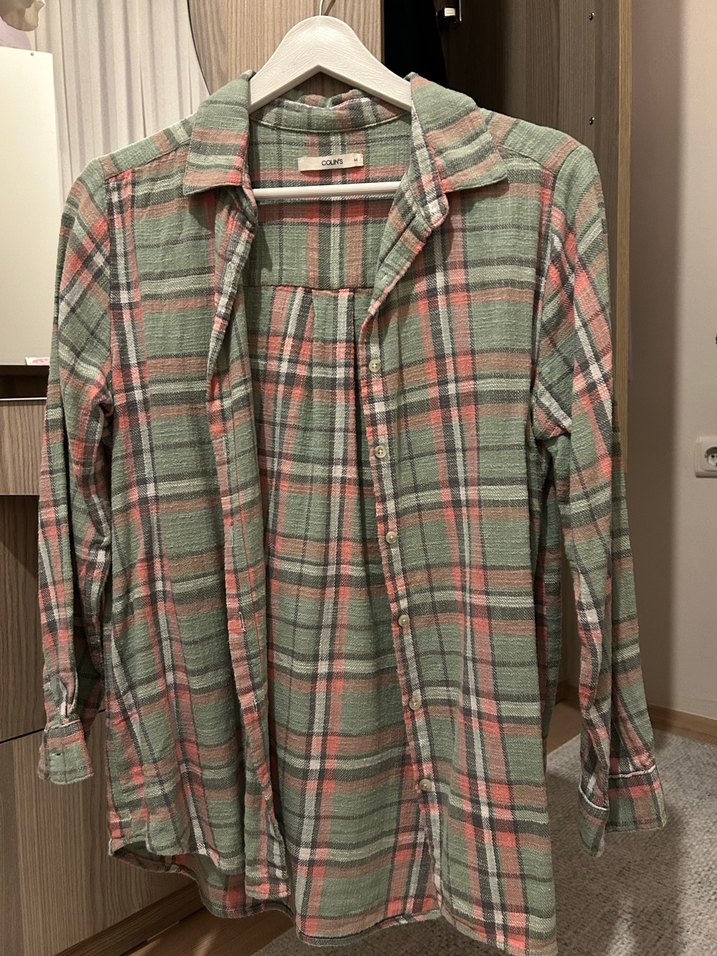 Gri renkte, keten kumaştan, düğmeli ve uzun kollu, midi boyda bohem tarzda rahat kesim gömlek.