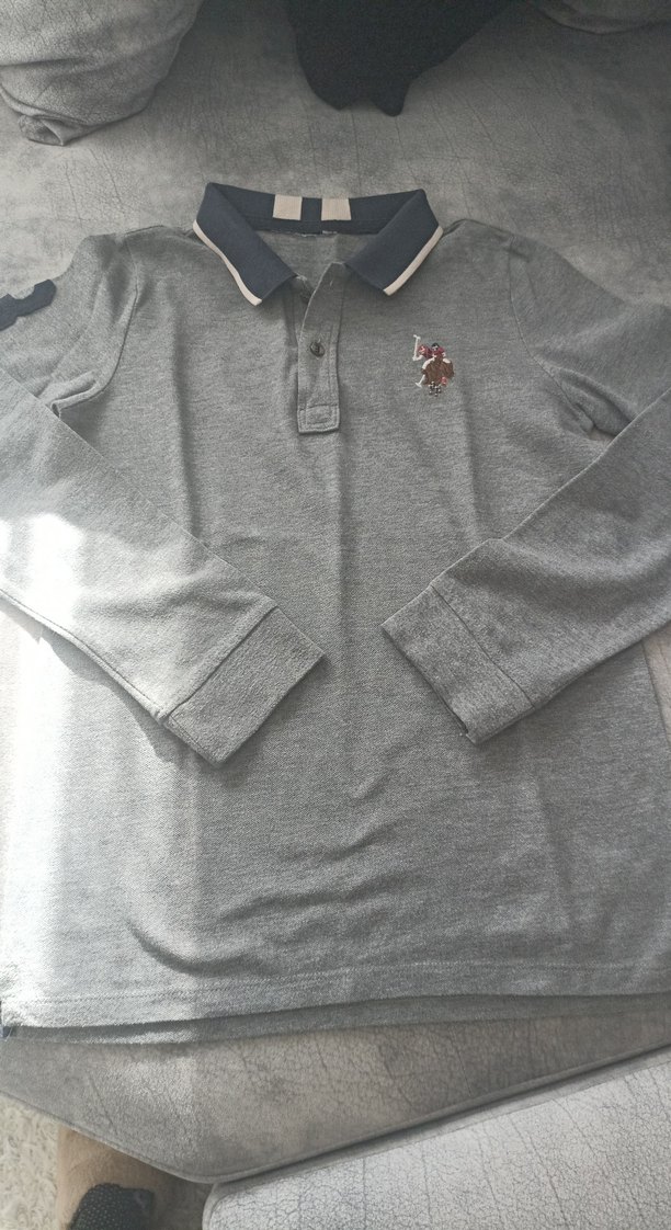 Gri uzun kollu polo tişört, düğmeli yakası ve baskılı logosu ile yumuşak ve sıcak kumaştan, çocuk 12 11 yaş 1 iki kere giyildi orjinaldir