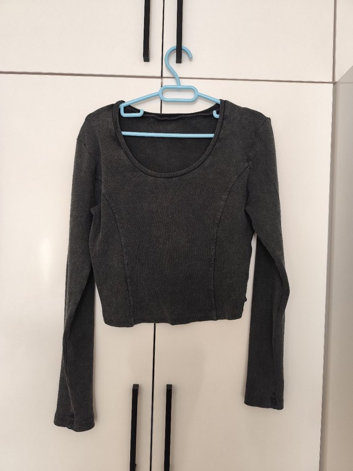 Gri renk, uzun kollu ve bisiklet yakalı crop top. Denim kumaştan, günlük kullanıma uygun rahat bir parça.