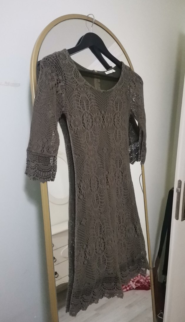 Uzun kollu, V yakalı ve dantel işlemeli gri triko elbise, bohem tarz için uygundur.