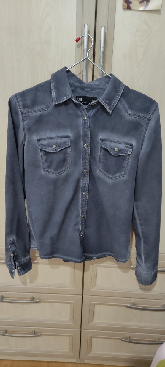 Gri denim kadın gömlek, düğmeli ön, kesik yaka ve uzun kolludur. İki cep ve bol kesimiyle rahat sokak stiline uygundur. Eskitme model gri kot gömlek