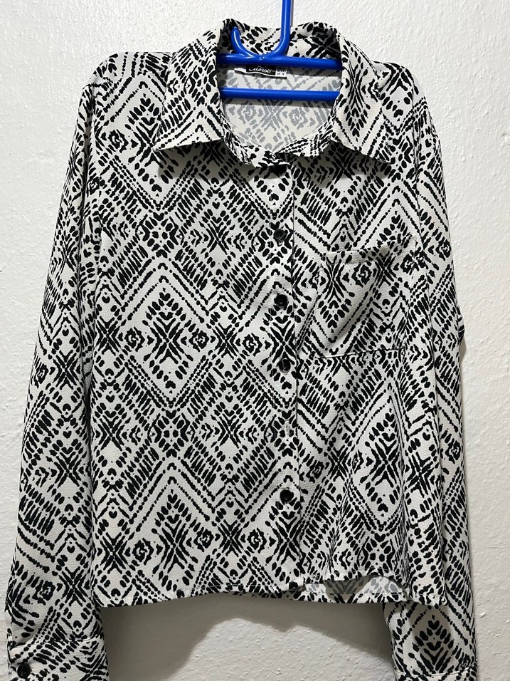 Uzun kollu, düğmeli ve kayık yaka detaylı desenli kadın gömleği, rahat kesimiyle günlük sokak stiline uygundur.