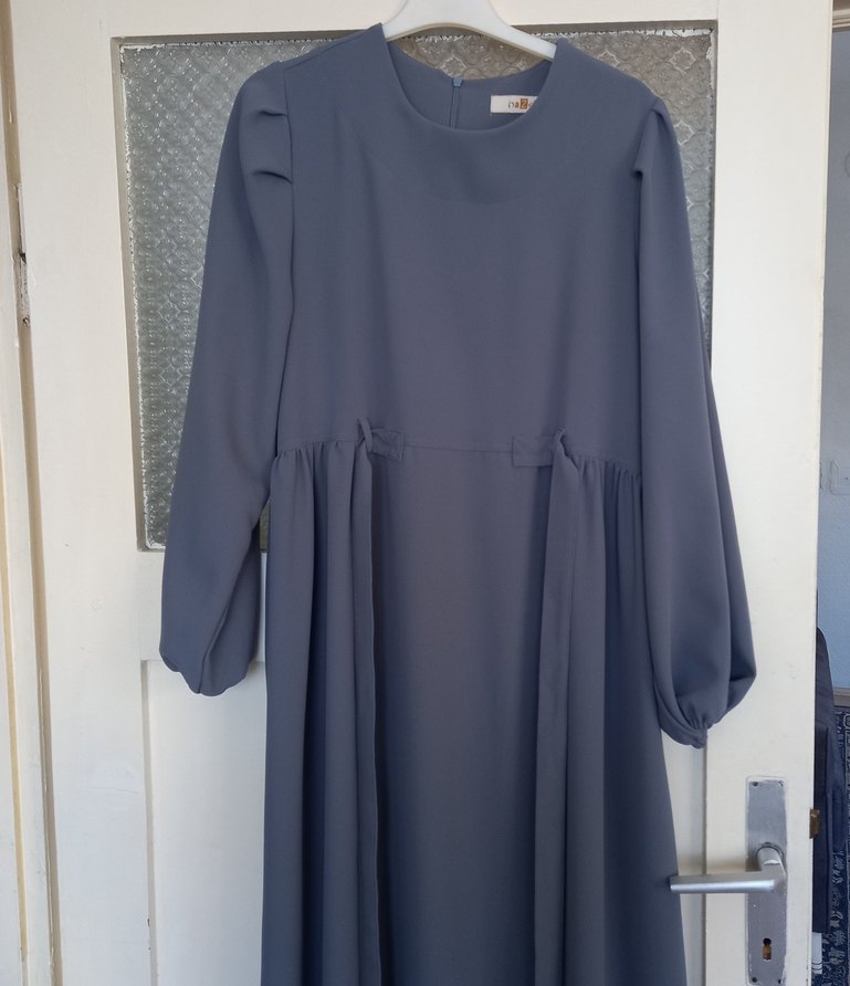 Gri renkte, uzun kollu ve dökümlü detaylara sahip bol kesim kadın elbisesi. Yuvarlak yaka ve minimalist modern klasik tarzıyla günlük kullanıma uygun. Sentetik kumaştan üretilmiştir.38 40 42 beden uyumludur