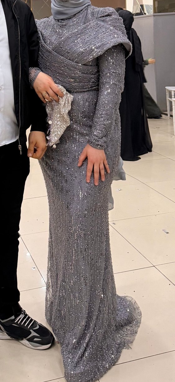 Gri renk, uzun kollu ve drapeli tasarıma sahip bu uzun abiye elbise, yılan deseni ve tekne yaka ile şık bir görünüm sunar. Düğünler için uygundur. ✨ 42 beden