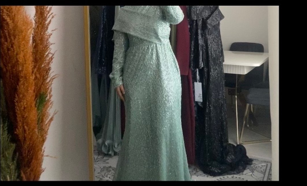 Gri Uzun Kollu Drapeli Abiye Elbise