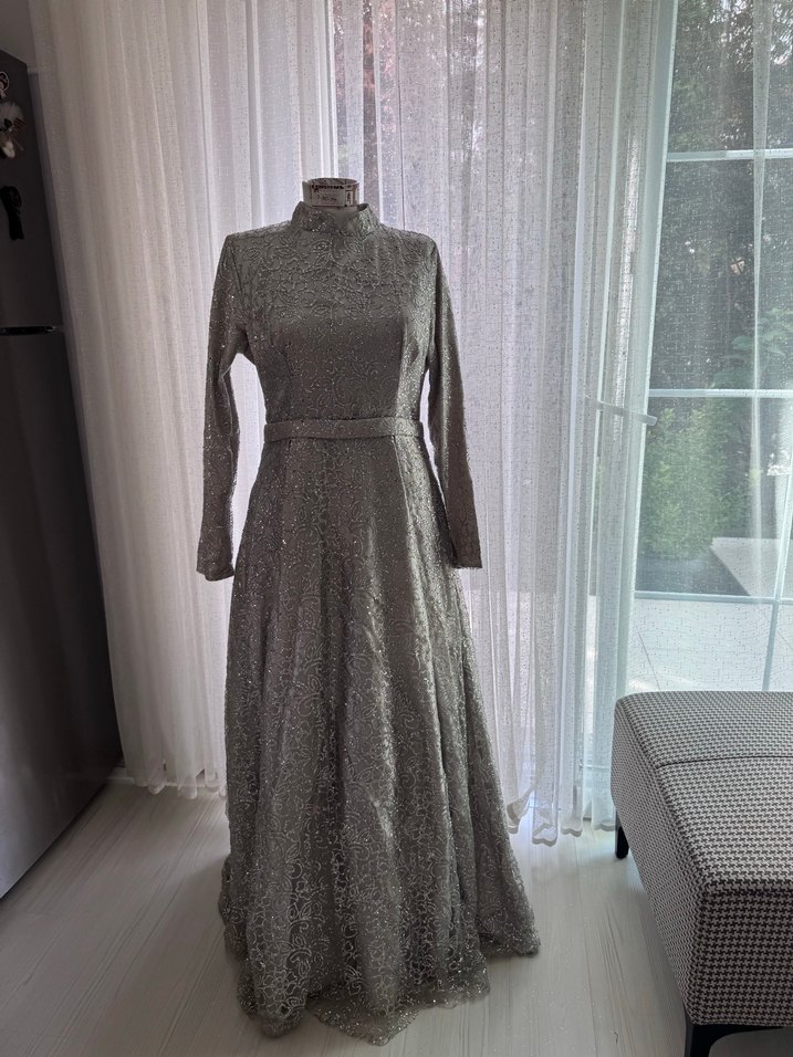 Gri renkte, yüksek yakalı ve uzun kollu, drapeli tasarıma sahip uzun abiye elbisedir. Düzenli kesimi ve modern tarzıyla düğün için uygundur. 40-42 arasında bedendır genısletılmek ıcın pay yapılmıstr ıstersenız 38 bedene düşürülebilir paylar çıkınca
