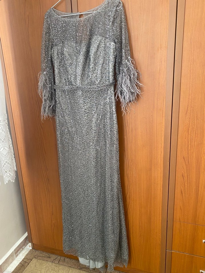 Uzun gri abiye elbise, . Kayık yaka, uzun kollu, tüy detaylı ✨ Bir kez giyildi boyu kısaltıldı. Sırt bölümünde aynı kumaştan ufak bir ekleme var fakat çıkarılabilir