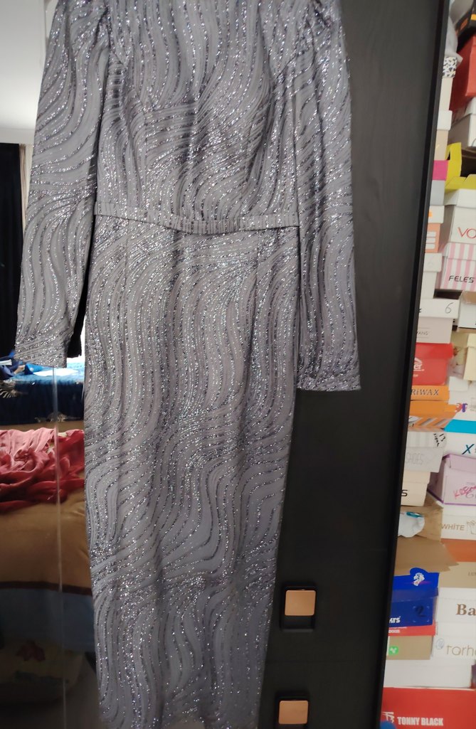 Drapeli detaylı, uzun kollu ve tek renk gri abiye elbise. Tekne yakası ve ince kesimiyle klasik şıklık sunar. ✨