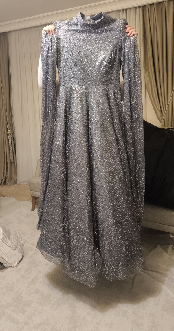 Gri renkte, uzun kollu ve kayık yaka drapeli abiye elbise. Salaş kesimi ve çağdaş tarzıyla düğünler için uygundur. ✨