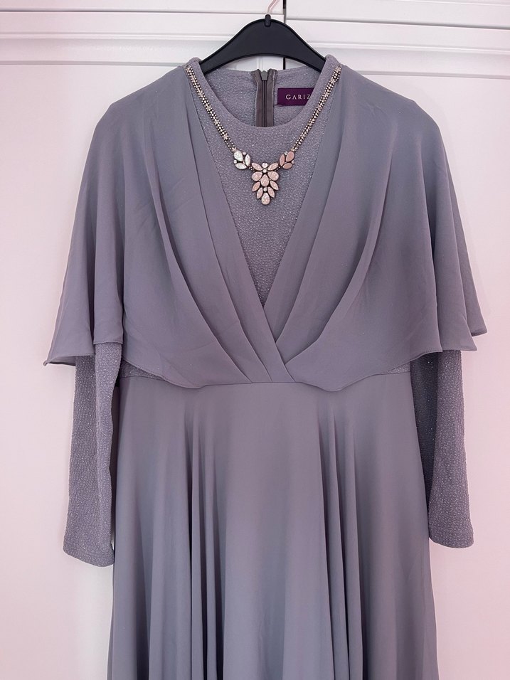 V yaka, drapeli tasarıma sahip uzun gri abiye elbise. Uzun kollu, bol kesim modern klasik stil, düğünler için uygun. 38-40 beden ✨