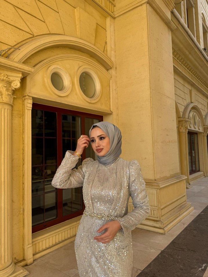 Fitted kesim, yüksek yakalı ve uzun kollu, etnik desenli ve drapeli tasarıma sahip açık gri uzun abiye elbise. ✨ Abiyemiz sıfır ayarındadır.38 42 beden uyumludur.Arkası ipliklidir.Satılıktır‼️‼️