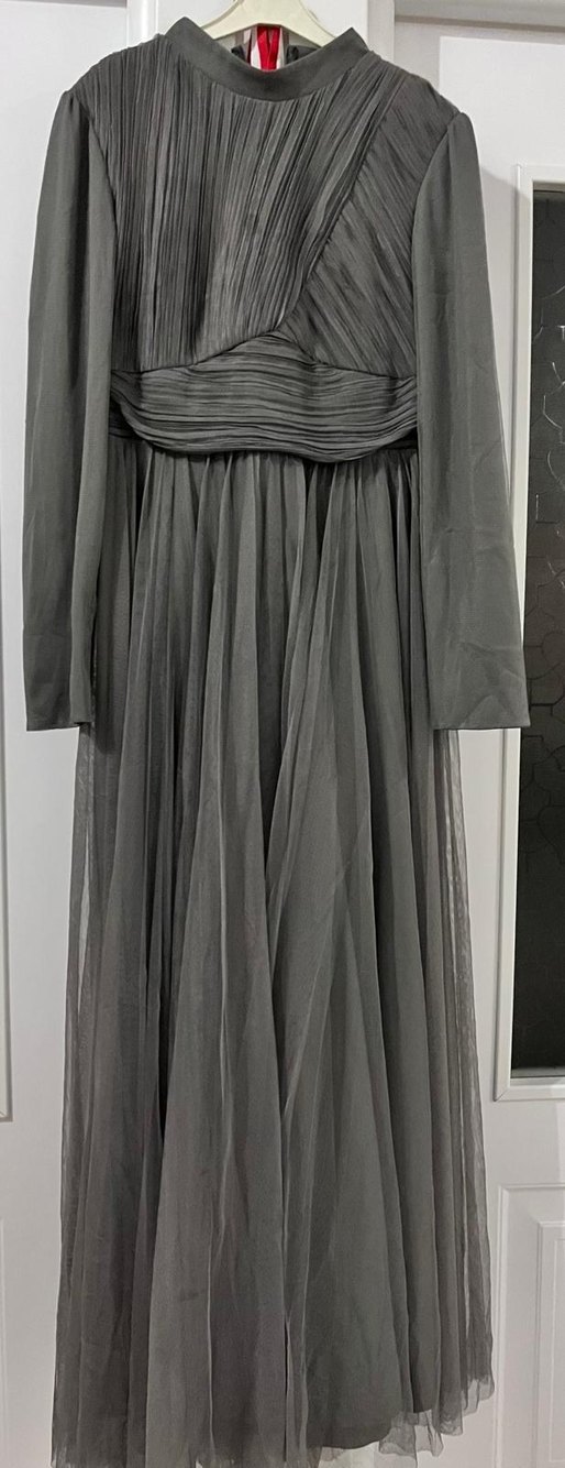 Gri Uzun Kollu Drapeli Kadın Abiye Elbise