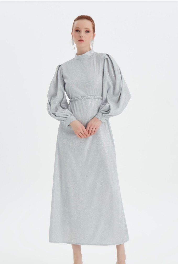Gri Uzun Kollu Drapeli Kadın Abiye Elbise