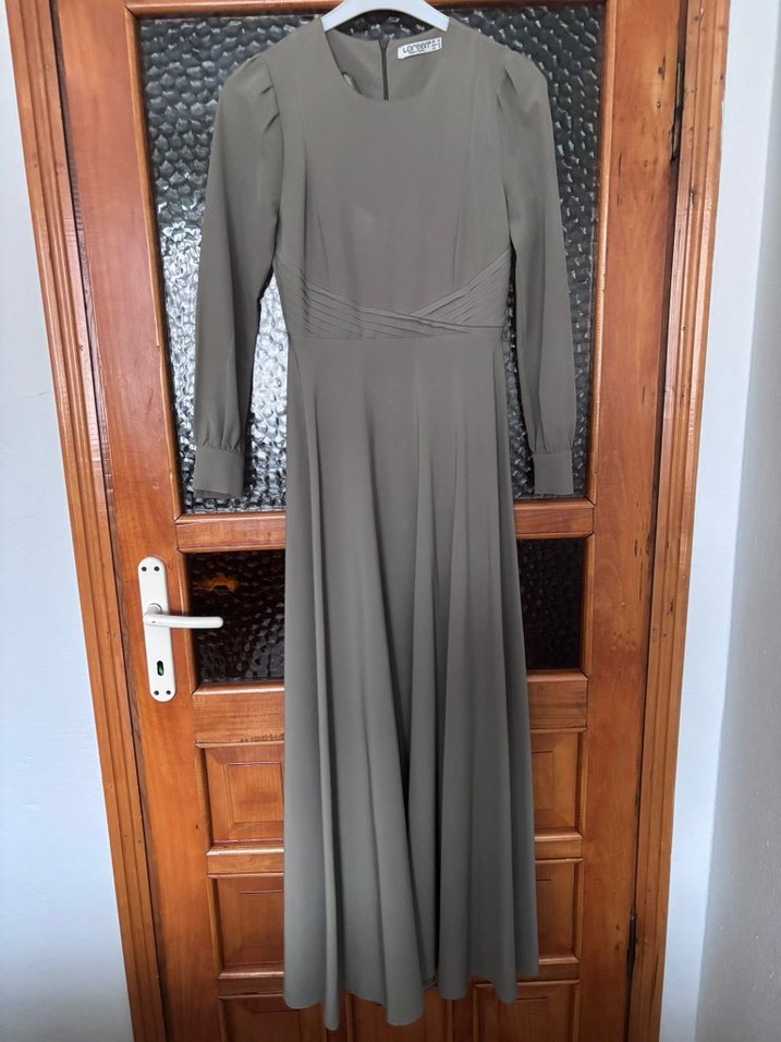 Gri renk, uzun kollu, yuvarlak yaka ve bel kısmında drapeli detaylı, sentetik kumaştan yapılmış klasik kesim uzun elbise. Ofis için uygundur.