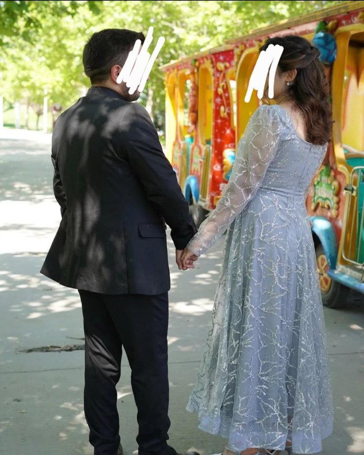 Nişan elbisesi, gri renkte, uzun kollu ve drapeli detaylarla klasik modern tarzda, kesimi vücuda oturan şık bir modeldir.