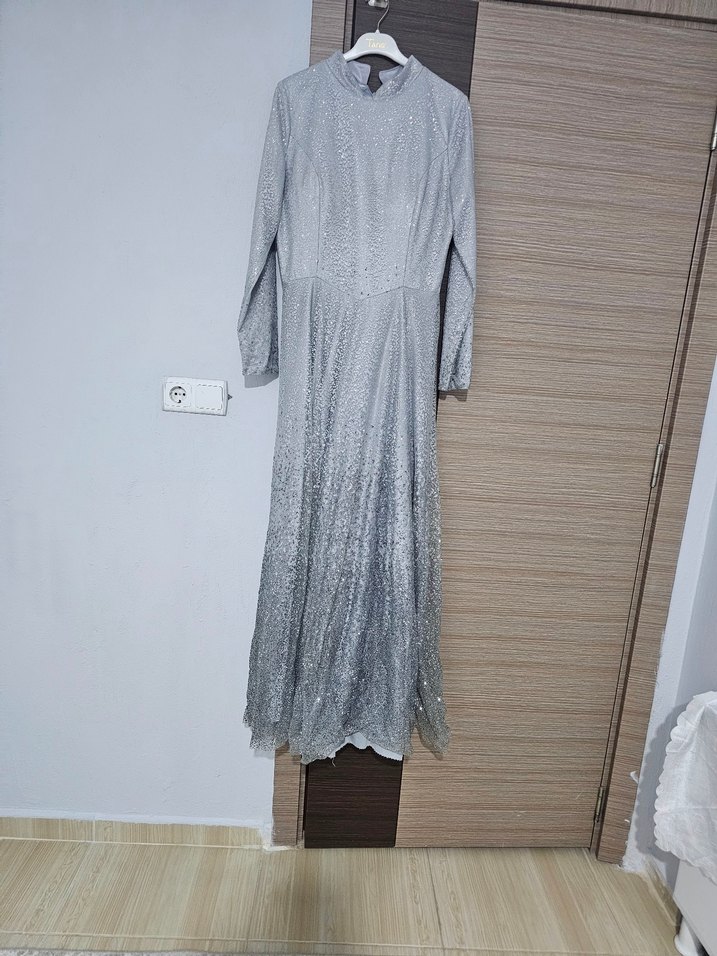 Drapeli detaylara ve yuvarlak yakaya sahip uzun, bol kesim gri abiye elbise. Uzun kollu, sade ve mütevazı tarzda, düğünler için uygun.