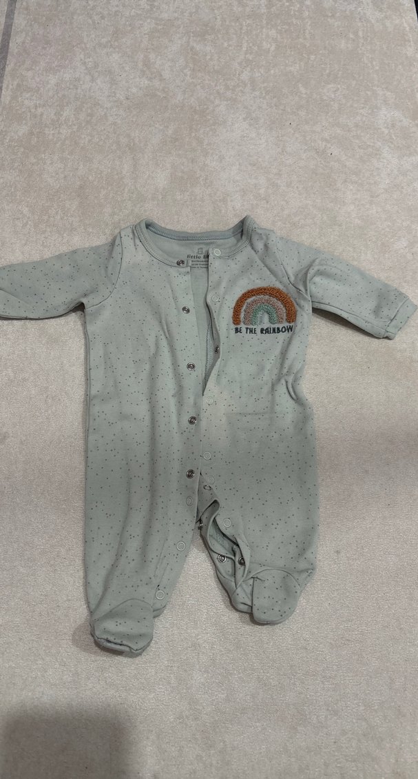 Gri uzun kollu, düğmeli ve bisiklet yaka bebek tulumu. Bağcıklı desen ve gökkuşağı nakışı bulunur. Yumuşak ve sıcak kumaştan yapılmıştır.